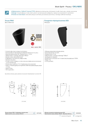 Pisuar wiszący FINO - Podtynkowy dopływ wody 135710BK Wisząca przegroda międzypisuarowa AZA 100620BK