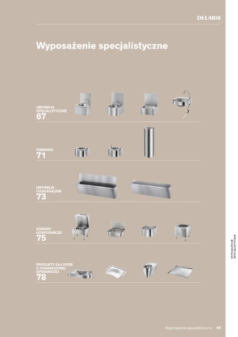 Wyposażenie specjalistyczne UMYWALKI SPECJALISTYCZNE 67 POIDEŁKA 71 UMYWALKI CHIRURGICZNE 73 KOMORY GOSPODARCZE 75 WYPOSAŻENIE SPECJALISTYCZNE PRODUKTY DLA OSÓB O OGRANICZONEJ SPRAWNOŚCI 78 Wyposażenie specjalistyczne 65