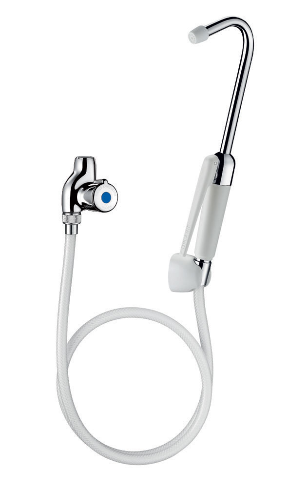 Spryskiwacz HYGIENA ze standardowym drążkiem i zagiętą pod kątem 65° końcówką nadającą się do demontażu.