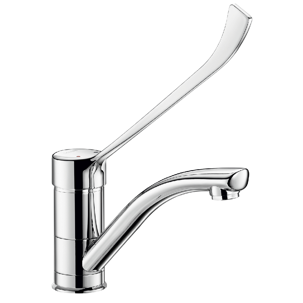 Jednootworowa bateria mechaniczna z ruchomą wylewką H.100 L.170 wyposażona w higieniczne sitko wypływowe.
