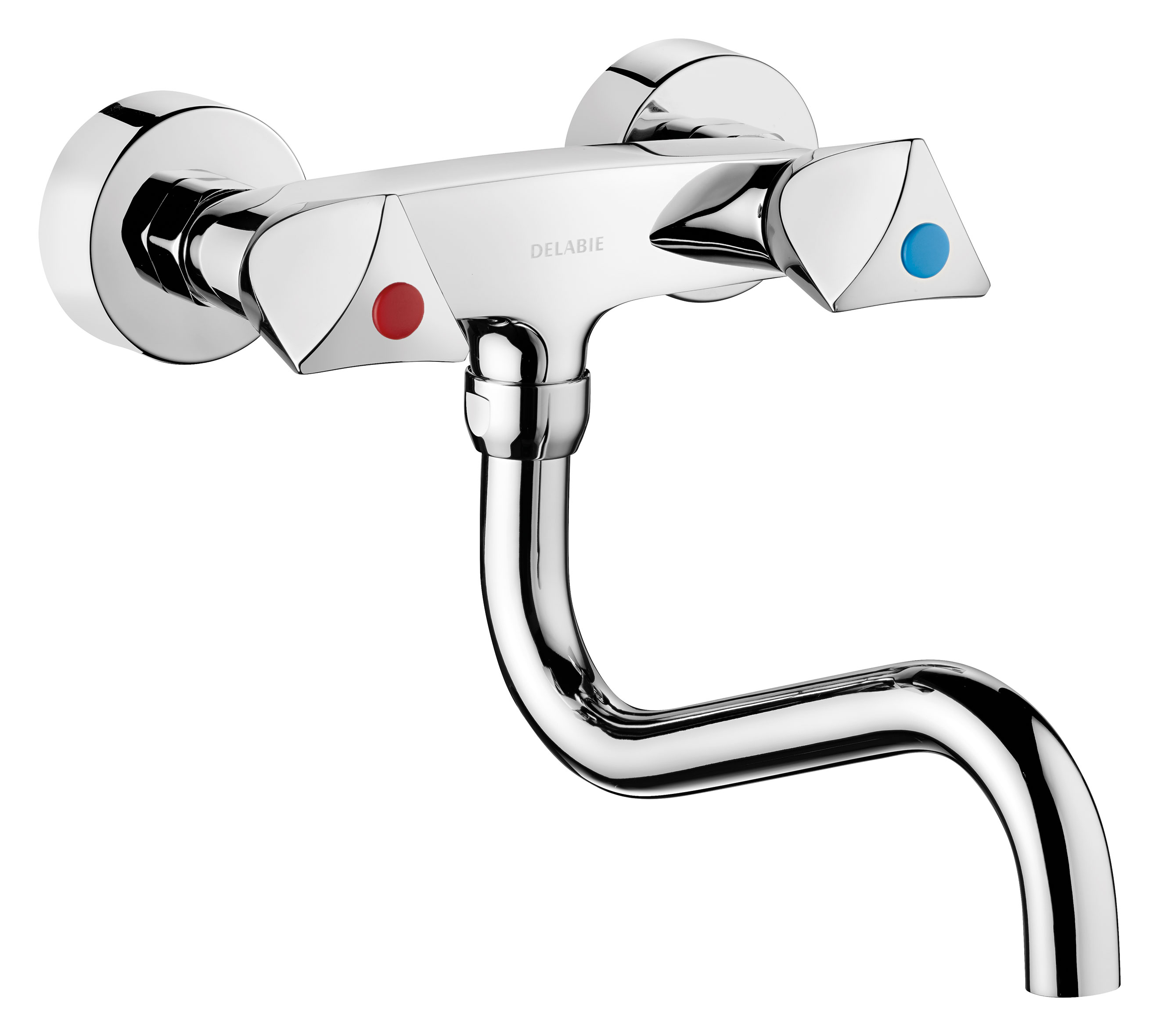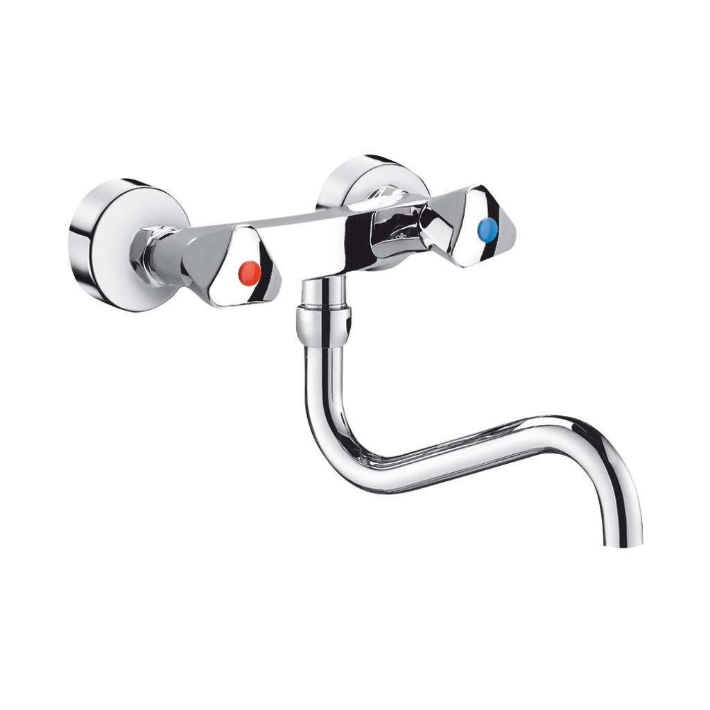 Nr 5445T2SŚcienna bateria mechaniczna do zlewu z dolną, ruchomą wylewką rura Ø22 L.200 z sitkiem gwiazda z mosiądzu.