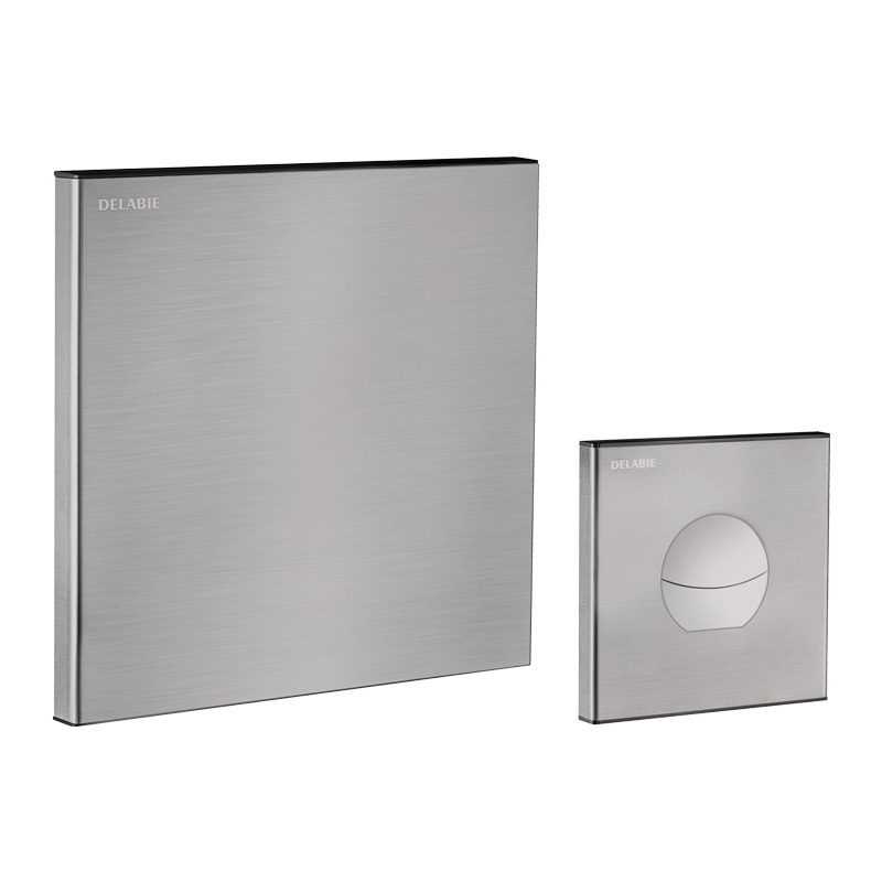 Czasowa płyta uruchamiająca 90 x 90 mm ze szczotkowanej stali nierdzewnej, z chromowanymi przyciskami.