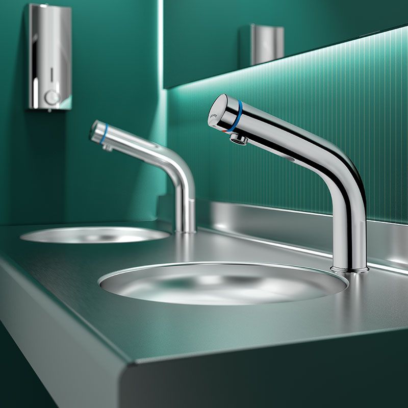 Stojąca, czasowa bateria umywalkowa na przycisk, który jest jednocześnie pokrętłem do regulacji temperatury.