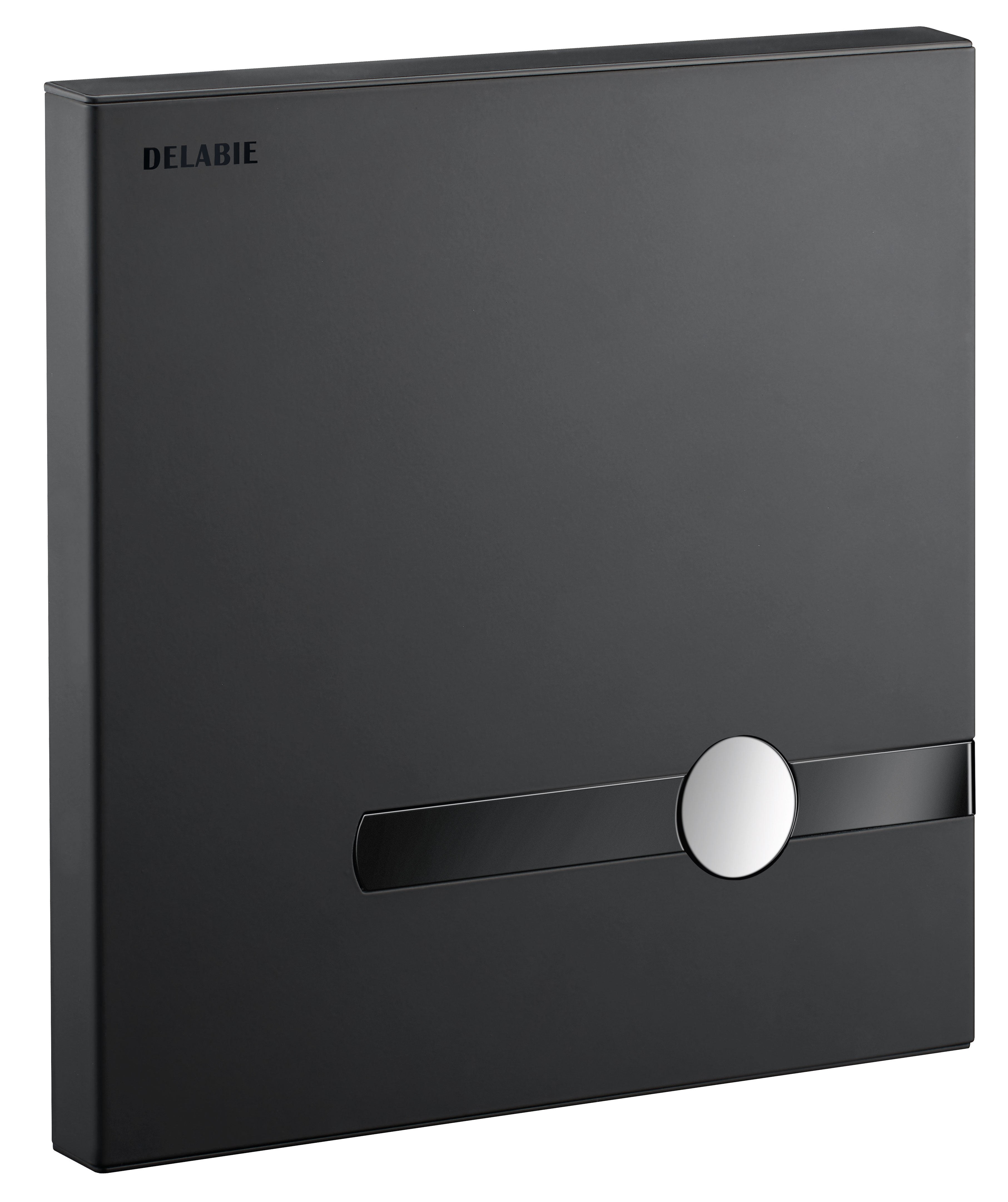 Płyta uruchamiająca 186 x 186 mm ze stali nierdzewnej w czarnym matowym wykończeniu, z przyciskiem z chromowanego metalu i wbudowaną elektroniką.