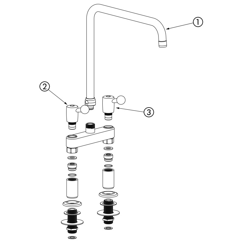 Nr 5603Dwuotworowa bateria gastronomiczna Z3/4", rozstaw 150 mm, na prostych kolumnach.