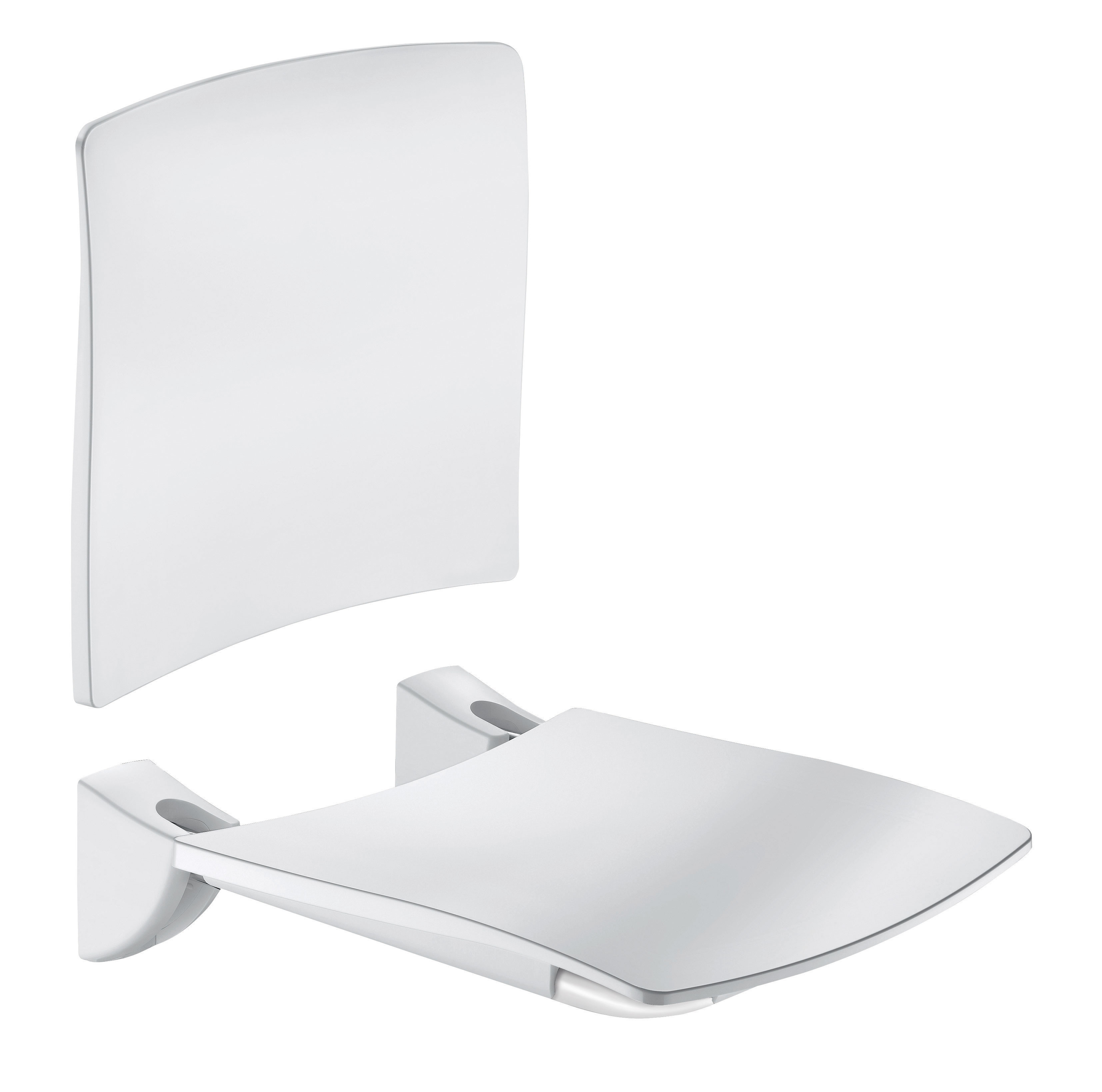 Nr 510434NSkładane siedzisko natryskowe Grand Confort HR z oparciem, do montażu na ścianie.