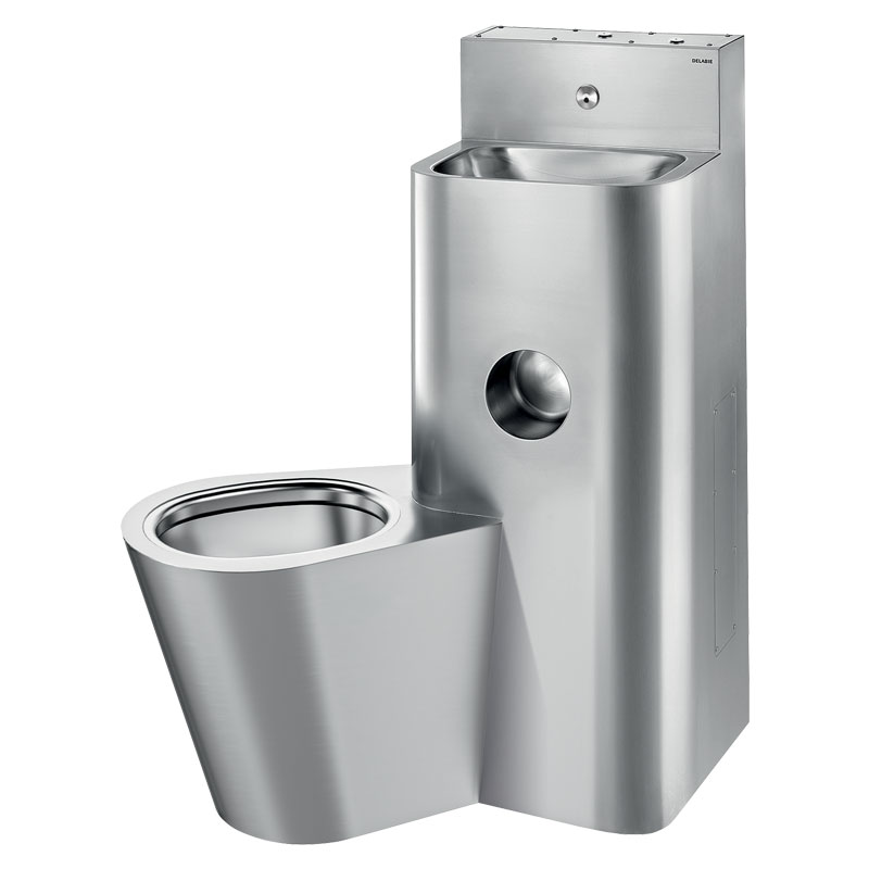 WC jest całkowicie przyspawane do umywalki, brak śrub: ułatwia to czyszczenie i zapobiega ukrywaniu przedmiotów.