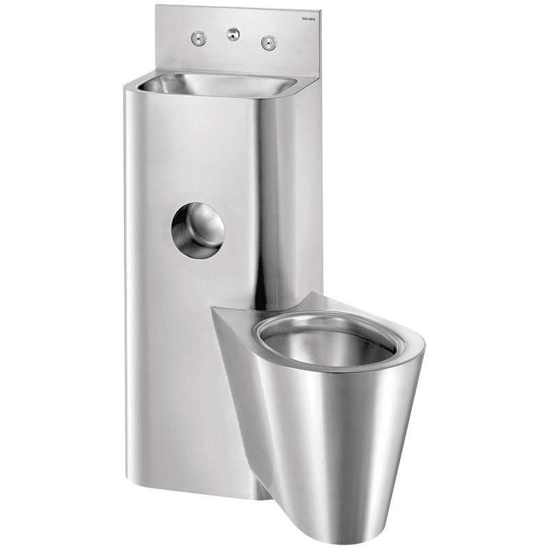 WC jest całkowicie przyspawane do umywalki, brak śrub: ułatwia to czyszczenie i zapobiega ukrywaniu przedmiotów.