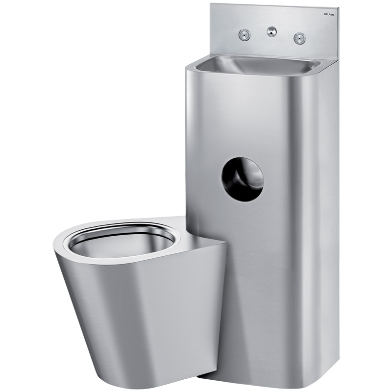 WC jest całkowicie przyspawane do umywalki, brak śrub: ułatwia to czyszczenie i zapobiega ukrywaniu przedmiotów.