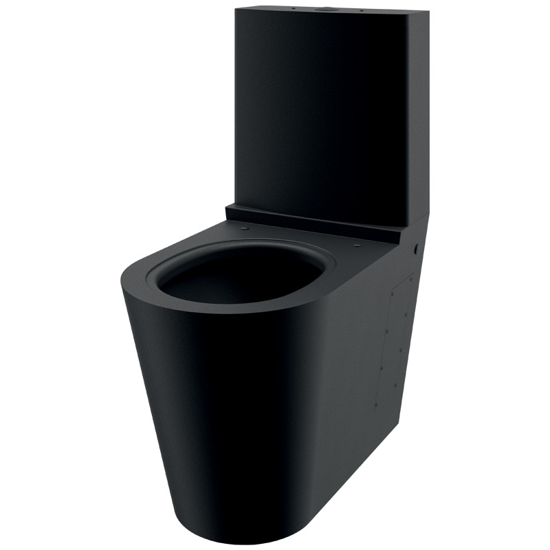 Otwory do zamocowania deski sedesowej. Dostarczana z zaślepkami z czarnego, matowego Inoxu do użytku bez deski sedesowej.